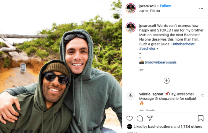 “Words can’t express how happy and STOKED I am for my brother Matt on becoming the next Bachelor!” he wrote via Instagram. “No one deserves this more than him. Such a great Dude!! #thebachelor #bachelor.”